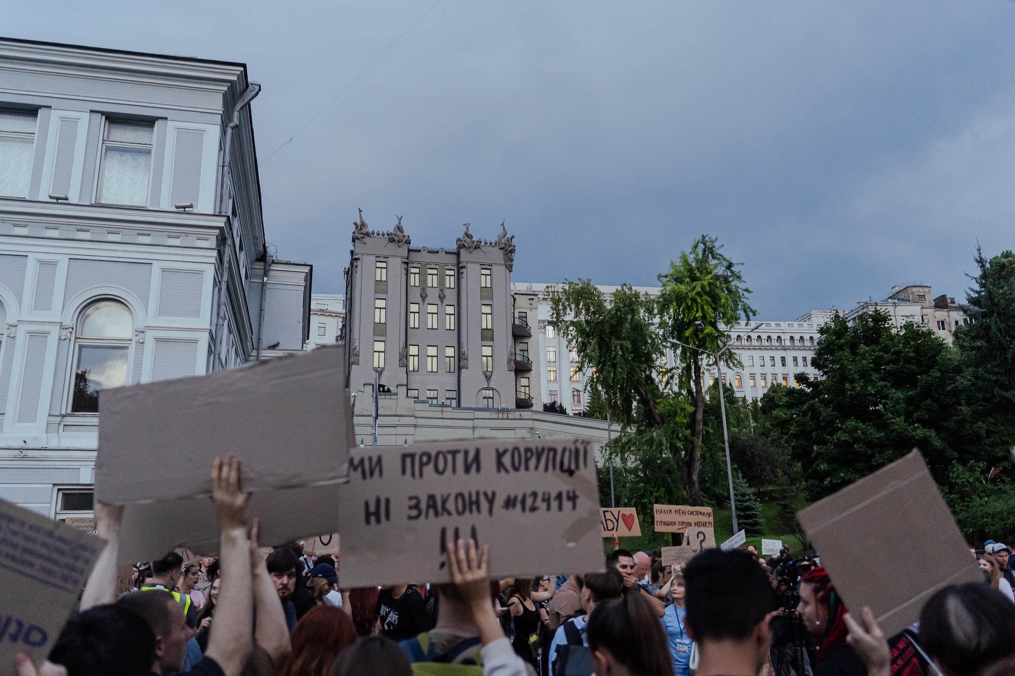 Головне гасло протесту, що скандує натовп, — «Вето на закон». Також чутно: «Ганьба», «Де ви, а де закон?» і старе майданівське: «Разом нас багато — нас не подолати». Хтось тримає в руках Конституцію, хтось — книгу «Чому нації занепадають».